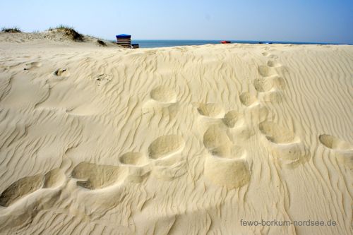 Spuren im Sand. Gerade Familien mit Kindern bevorzugen häufig den Südstrand. Keine weiten Wege zum Wasser. Das Trampolin übt eine magische Anziehungskraft auf Kinder aus und bietet Eltern die Chance, einmal in Ruhe im Strandkorb die Zeitung zu lesen oder die herrliche Aussicht auf die Nordsee zu genießen.
