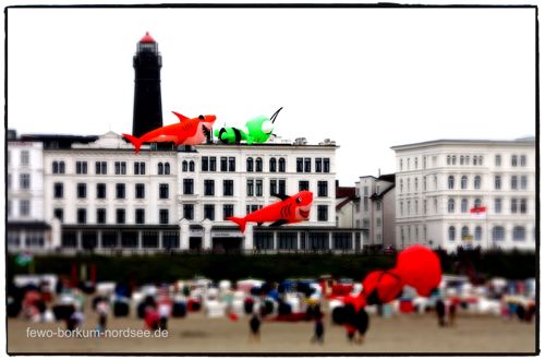 Bunte Drachen vor der typischen Bäderarchitektur der Insel Borkum. Drachen steigen zu lassen, gehört für Kinder einfach zum Nordseeurlaub dazu. Aber auch Erwachsene haben ihren Spaß beim Kiten oder mit dem Strandbuggy. Das Foto wurde anlässlich des jährlichen Drachenfestivals auf Borkum gemacht.