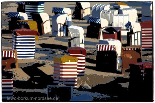 Strandkörbe und die typischen quer gestreiften Borkumer Strandzelte laden zum Lesen oder einfach nur zum Träumen ein. Am Strand bieten Schutz vor Wind und Sonne und schützen auch, wenn sie, wie hier vor den großen Hotels an der Strandpromenade etwas enger stehen, vor ungewollten Blicken.