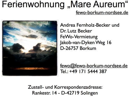 Anbieter und verantwortlich für den redaktionellen Inhalt dieser Webpage sowie die auf unsere Ferienwohnung bezogenen sozialen Medienangebote auf Facebook (facebook.com/Ferienwohnung.Borkum), Google+ sowie in Buchungsportalen, wie Traum-Ferienwohnungen.de gemäß § 10 Absatz 3 MDStV, 5 TMG sowie Verantwortlicher für den Datenschutz im Sinne des BDSG sowie des Art. 4 DSVGO (Datenschutz-Grundverordnung)